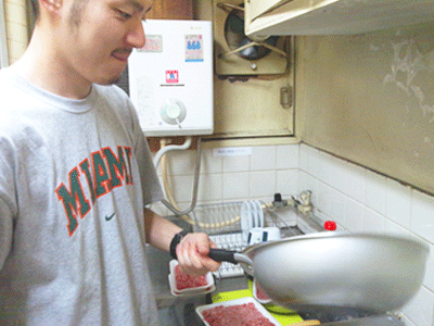 まだ食材が入っていないのに、フライパンをまわすタナカ